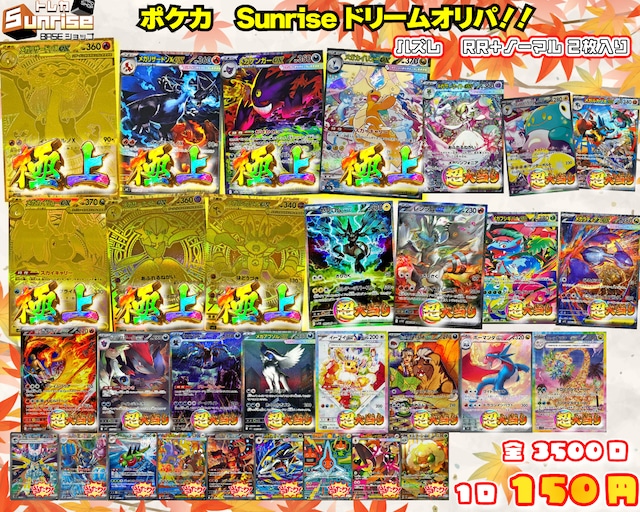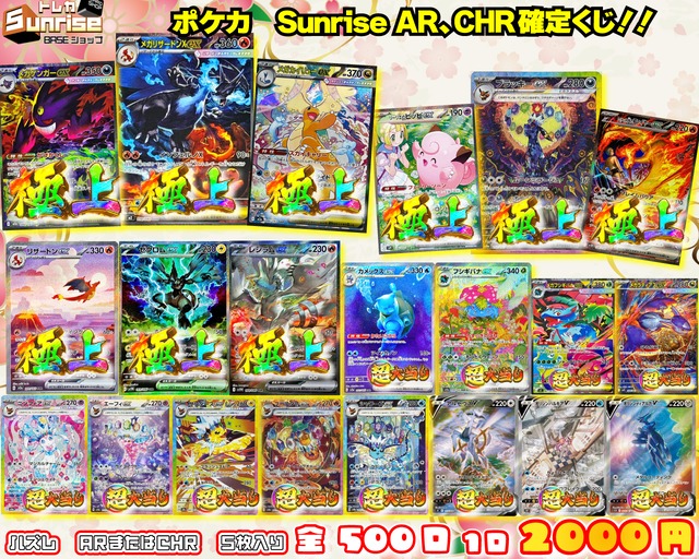 数ある商品の中からトレカサンライズの商品に目を通していただきありがとうございます。 人気のARやCHRをブロックにした サンライズ特製!Sunrise AR・CHR確定くじ!!が新登場!!! 今回の極上当たりは、 「メガリザードンXex(SAR)」 「メガゲンガーex(SAR)」 「メガカイリューex(SAR)」 「リーリエのピッピex(SAR)」 「ブラッキーex(SAR)」 「ロケット団のファイヤーex(SAR)」 「リザードンex(SAR)(151)」 「ゼクロムex(SAR)」 「レシラムex(SAR)」 などなど! その他当たりも豪華仕様! 最低保証のAR・CHRも小当たり封入中!!! ⭐︎当たり一覧 画像内リスト R7/12/17時点レート参照 販売開始時間R7/12/17 21時00分〜 ☆外れカード例 (AR・CHR) 5枚 合計5枚 全500口(BASE限定) ※オンラインストアでの販売は行っておりません。 1口5枚 梱包内容 各透明スリーブ+両面黒スリーブ+梱包材 ⭐︎残り口数。その他ご質問などお気軽にメッセージ機能TwitterDMにてお声掛けください ご購入していただき、楽しく開封していただけると幸いです。 配送方法 ★ゆうパケット★ ・送料は一律385円。 (送料+梱包代等) ※こちらの商品はゆうパケットを推奨しております※ ※購入金額が高額であれば、ゆうパックで配送する場合がございます※ ・また配送状況はこちらから郵便局に問い合わせし、お調べ致しますのでお気軽にお問い合わせください。 ・配送時の事故で商品が破損・紛失してしまった場合はこちらでは対応できませんのであらかじめご了承ください。 ・地域によっては台風等の影響などによる配送物遅延もございましたのでそちらに関しましてもお調べ致しますのでお気軽にお問い合わせください。 ・内容物に傷有りの商品が封入している場合がございます。 ・商品の返品・交換は出来ませんので予めご了承ください。 ・引いたカードの内容によってレビュー評価をつけるのはご遠慮ください。