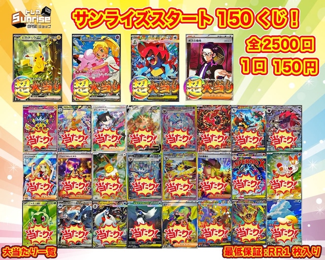 数ある商品の中からトレカサンライズの商品に目を通していただきありがとうございます。 スタートデッキ発売記念! サンライズスタート150くじ!が新登場! 今回の超大当たりは、 「ピカチュウex(764/742)(SAR仕様)」 「リーリエのピッピex(765/742)(SAR仕様)」 「メガオーダイルex(763/742)(SAR仕様)」 「ボスの指令(カラスバ)(760/742)(SR仕様)」 などなど! その他当たりも豪華仕様! ⭐︎当たり一覧 画像内リスト R7/12/19時点レート参照 販売開始時間R7/12/19 22時00分〜 ☆外れカード例 RR 1枚入り ※新レギュレーション(スタンダード)対応でG以降のみ! 是非デッキに採用してください! BASEショップ 2500口(BASE限定) ※公式ストアでの販売は行っておりません。 1口1枚 梱包内容 青スリーブ+梱包材 ⭐︎残り口数。その他ご質問などお気軽にメッセージ機能TwitterDMにてお声掛けください ご購入していただき、楽しく開封していただけると幸いです。 ・送料は一律385円。 (送料+梱包代等) ※こちらの商品はゆうパケット配送を推奨しております※ ※購入金額が高額であれば、ゆうパックで配送する場合がございます。 ・配送時の事故で商品が破損・紛失してしまった場合はこちらでは対応できませんのでおらかじめご了承ください。 ・地域によっては台風等の影響などによる配送物遅延もございましたのでそちらに関しましてもお調べ致しますのでお気軽にお問い合わせください。 ・内容物に傷有りの商品が封入している場合がございます。 ・商品の返品・交換は出来ませんので予めご了承ください。 ・引いたカードの内容によってレビュー評価をつけるのはご遠慮ください。